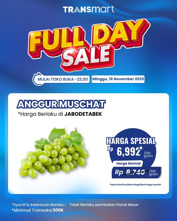Transmart Full Day Sale kembali hadir dengan diskon besar-besaran hingga 50% + 20%. Promo untuk berbagai produk berlaku hanya pada Minggu (16/11/2025) mulai dari toko buka sampai pukul 22.00 waktu setempat.